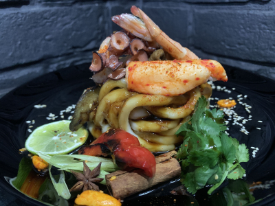 Камчатский краб, курильский гребешок, тигровые креветки, тайская лапша удон, сладкий перец, шампиньоны, баклажан, орешки кешью, кинза, лук зеленый, специи силасу, кунжут, сладко-пряный соус от Бренд-Шефа