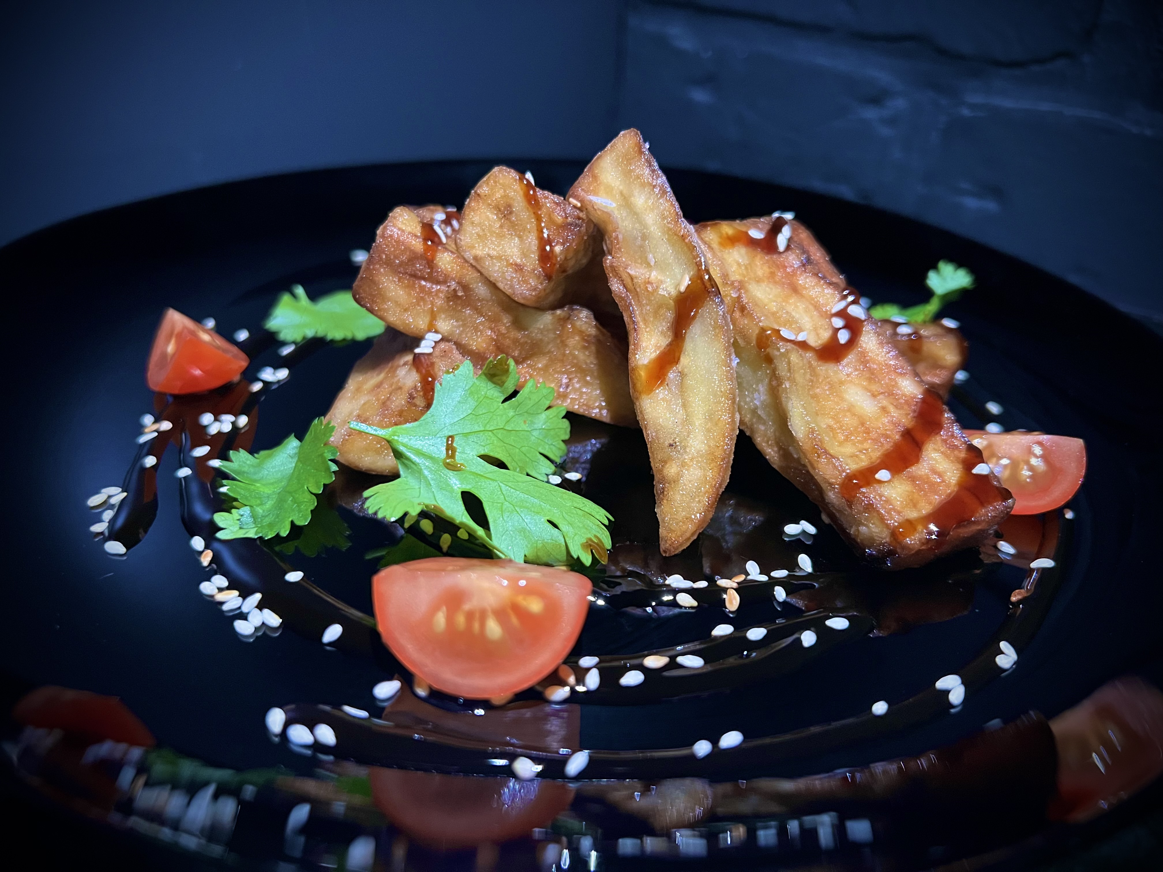 Жареные баклажаны в соусе терияки, томаты черри, свежая зелень, кунжут