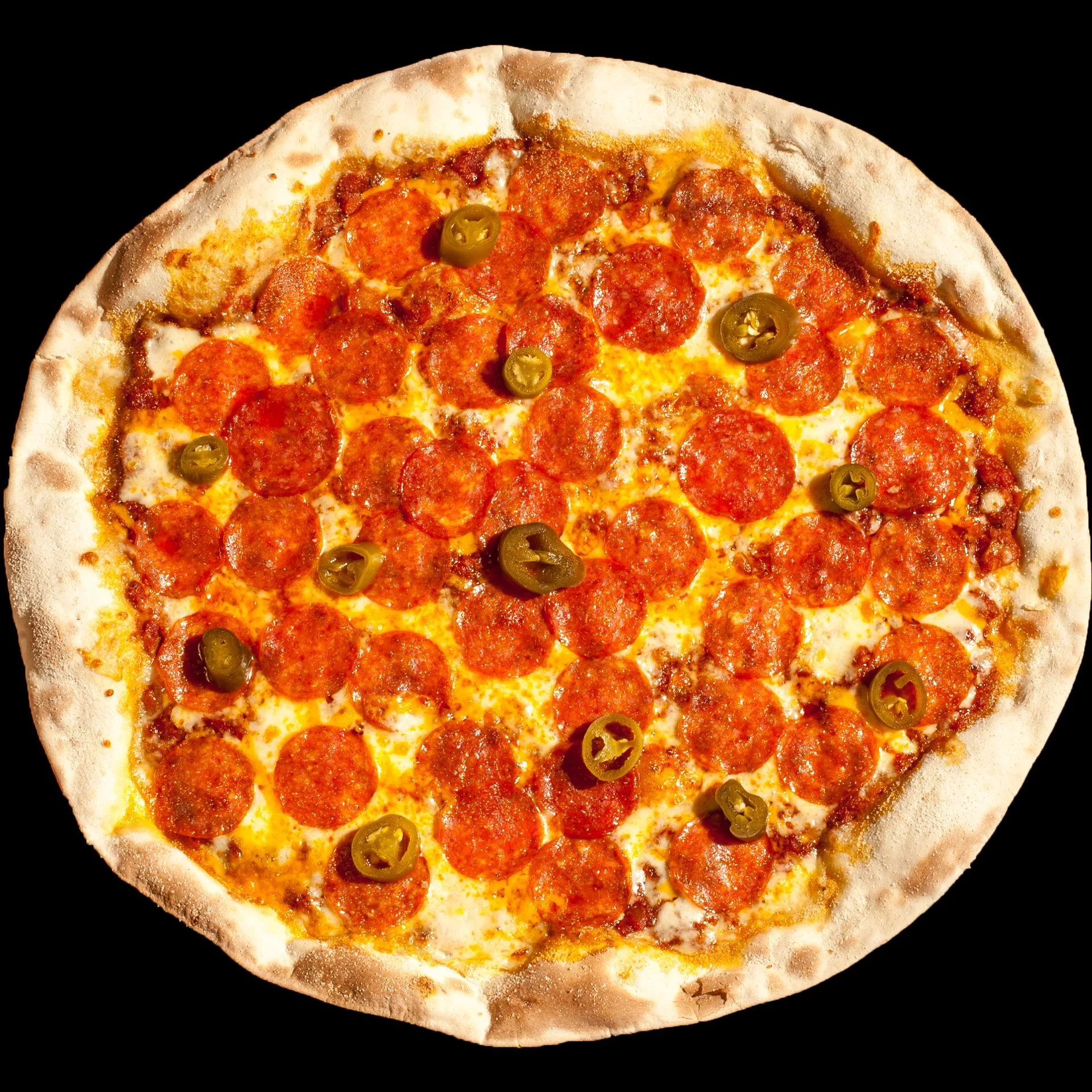Красный соус Turtle’s, сыр чеддер, сыр моцарелла, колбаски пепперони, острые перчики халапеньо, орегано