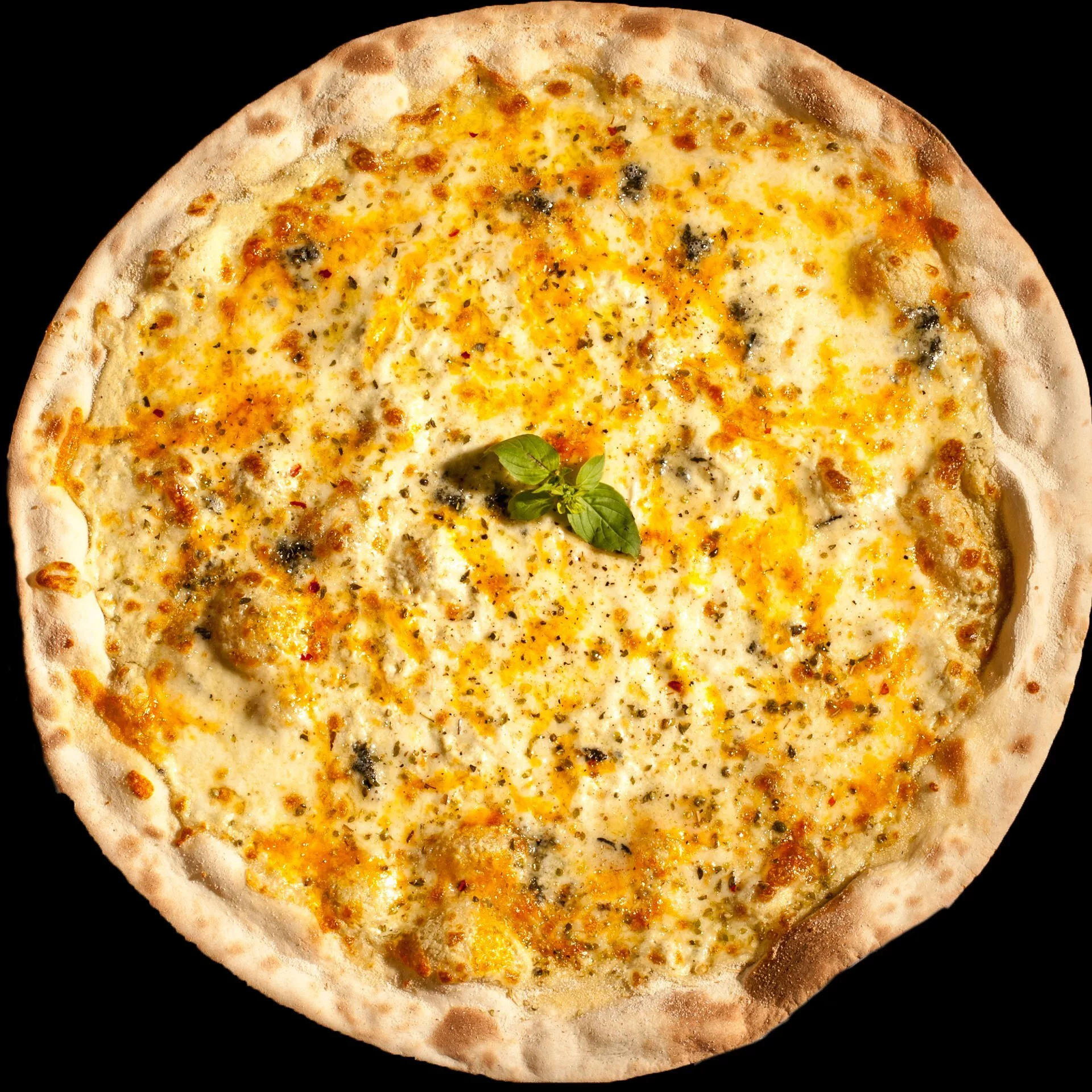 Белый соус Turtle's, сыр моцарелла, сыр горгонзола, сыр грана падано, сыр чеддер, свежий базилик, орегано