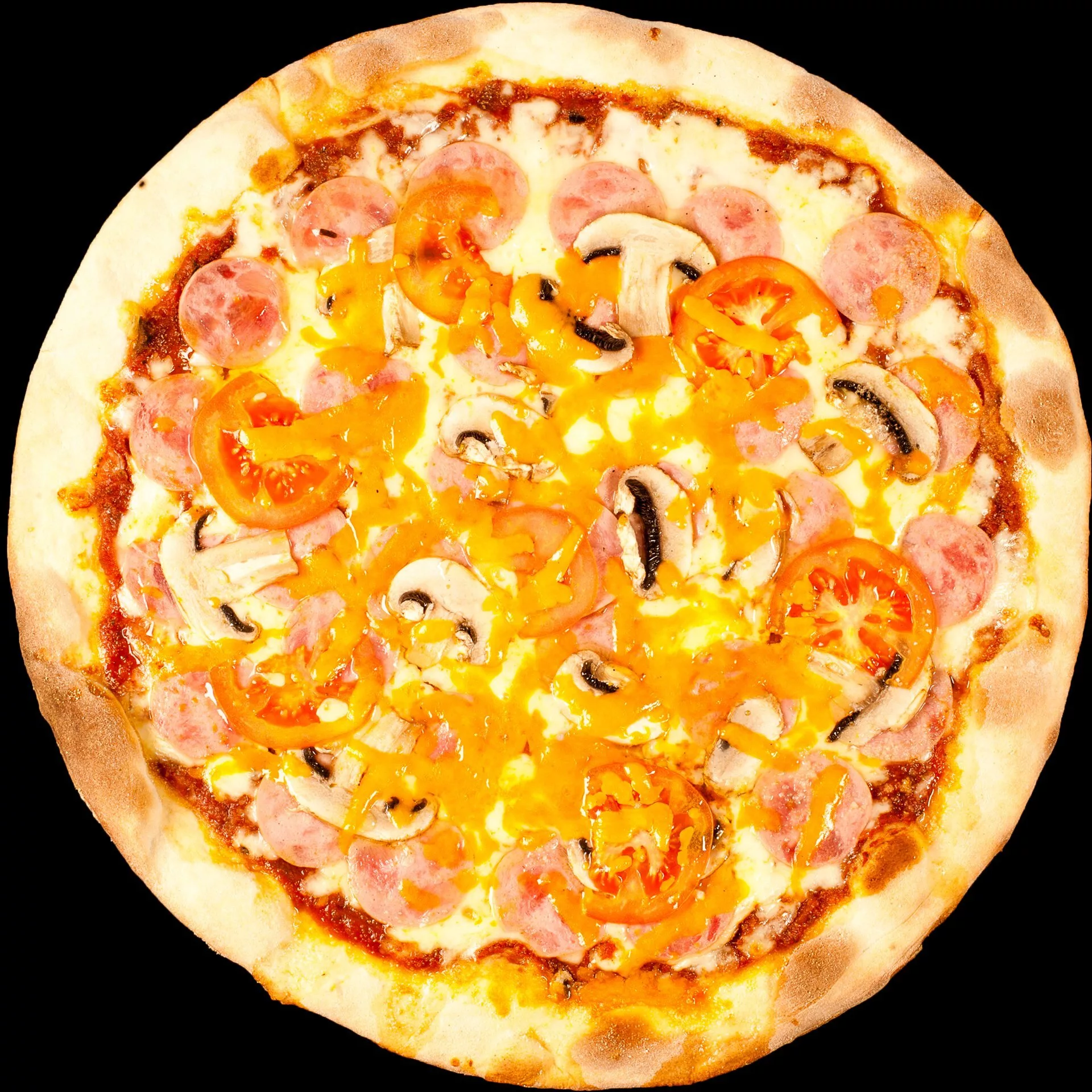 Красный соус Turtle’s, сыр моцарелла, сыр чеддер, шампиньоны, ветчина, томаты, орегано