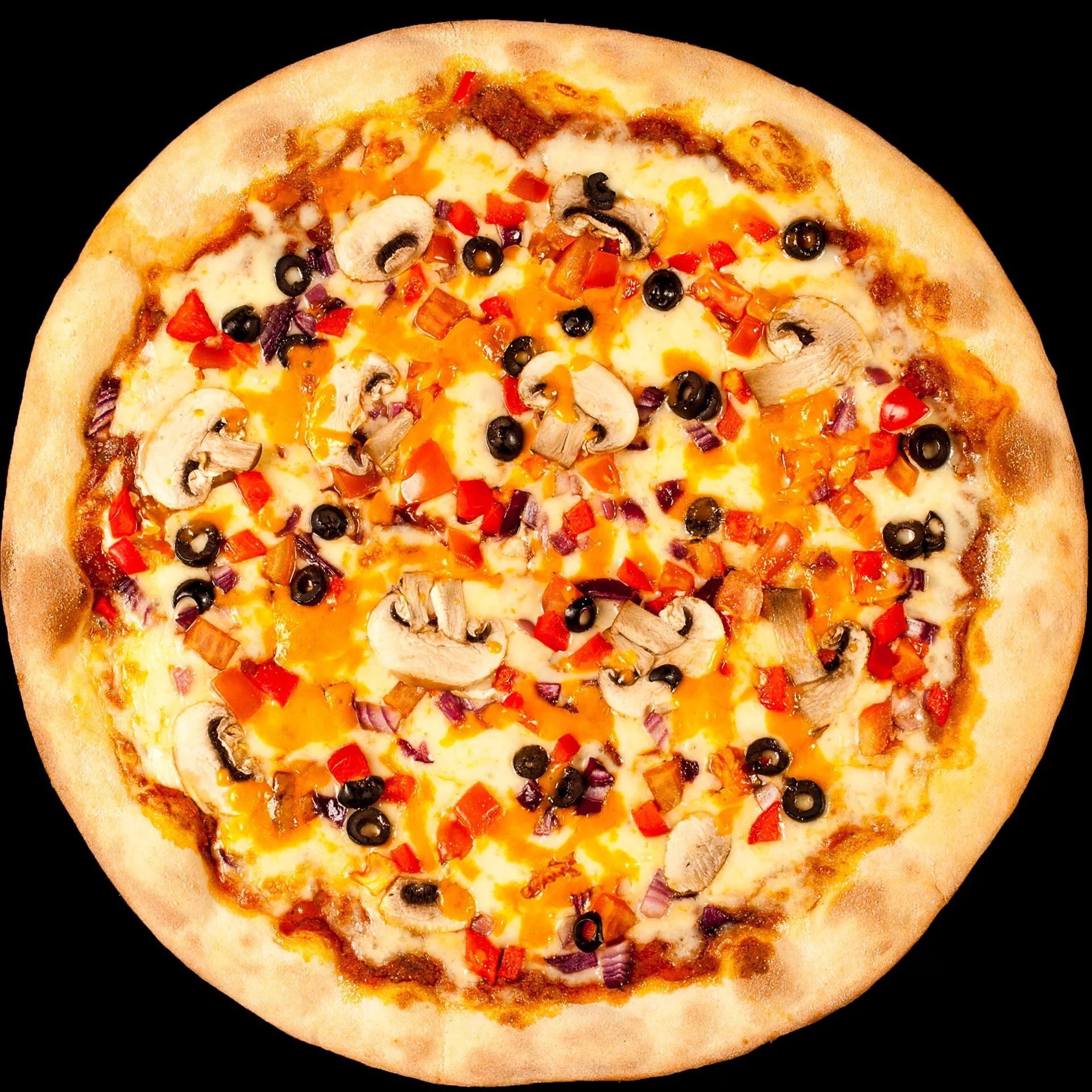 Красный соус Turtle's, сыр Моцарелла, сыр Чеддер, венские колбаски, красный лук, свежие томаты, маслины, кисло-сладкая горчица, орегано, оливковое масло
