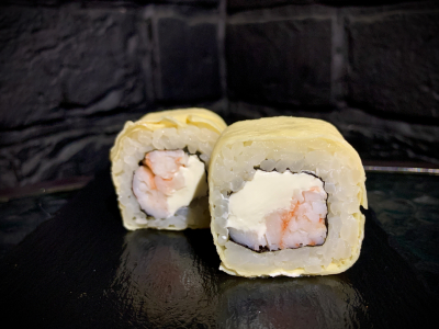 Тигровые креветки, сливочный крем-сыр, японский блинчик (чакин)