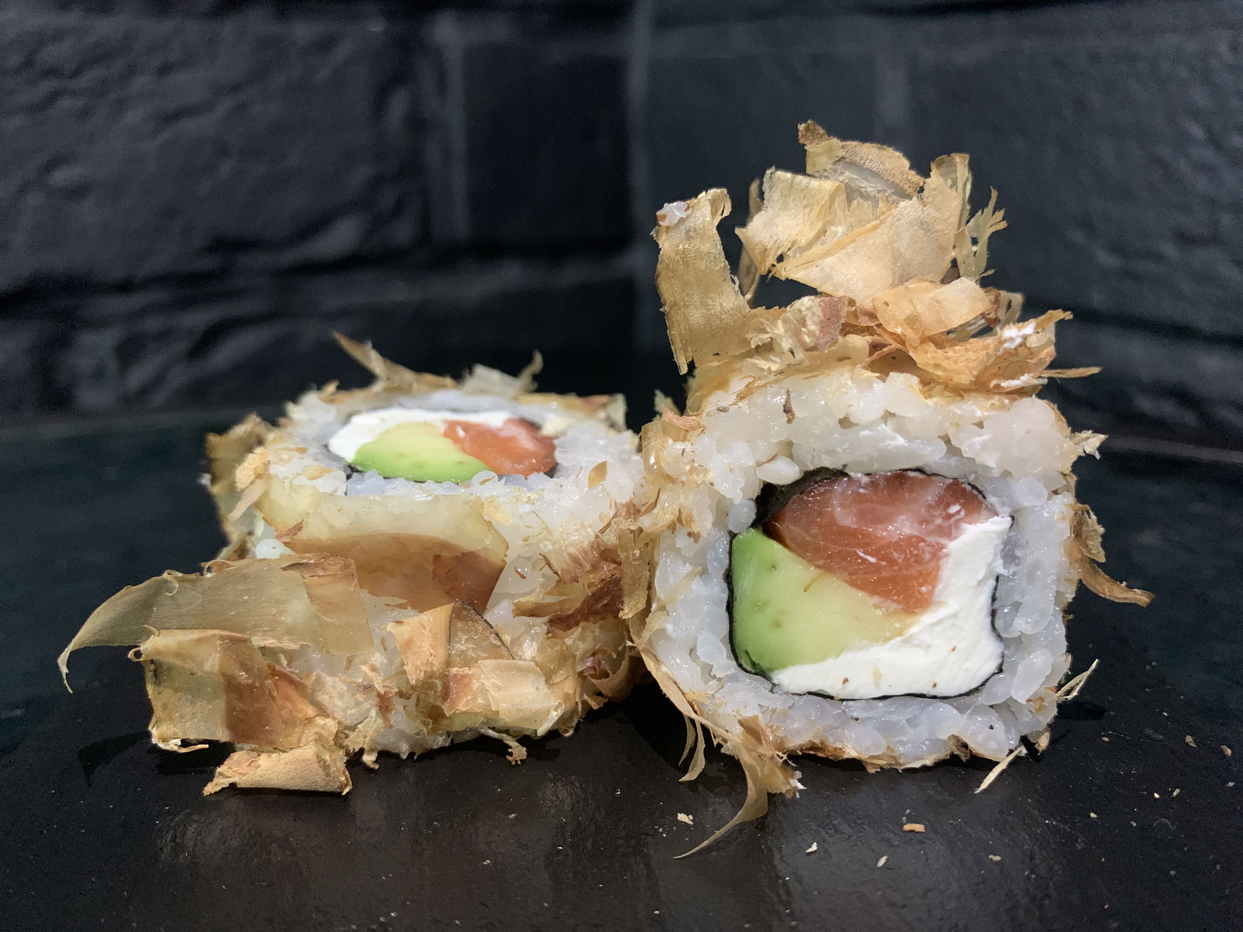 Охлажденный лосось, сливочный крем-сыр, спелый авокадо, стружка тунца (Бонито)