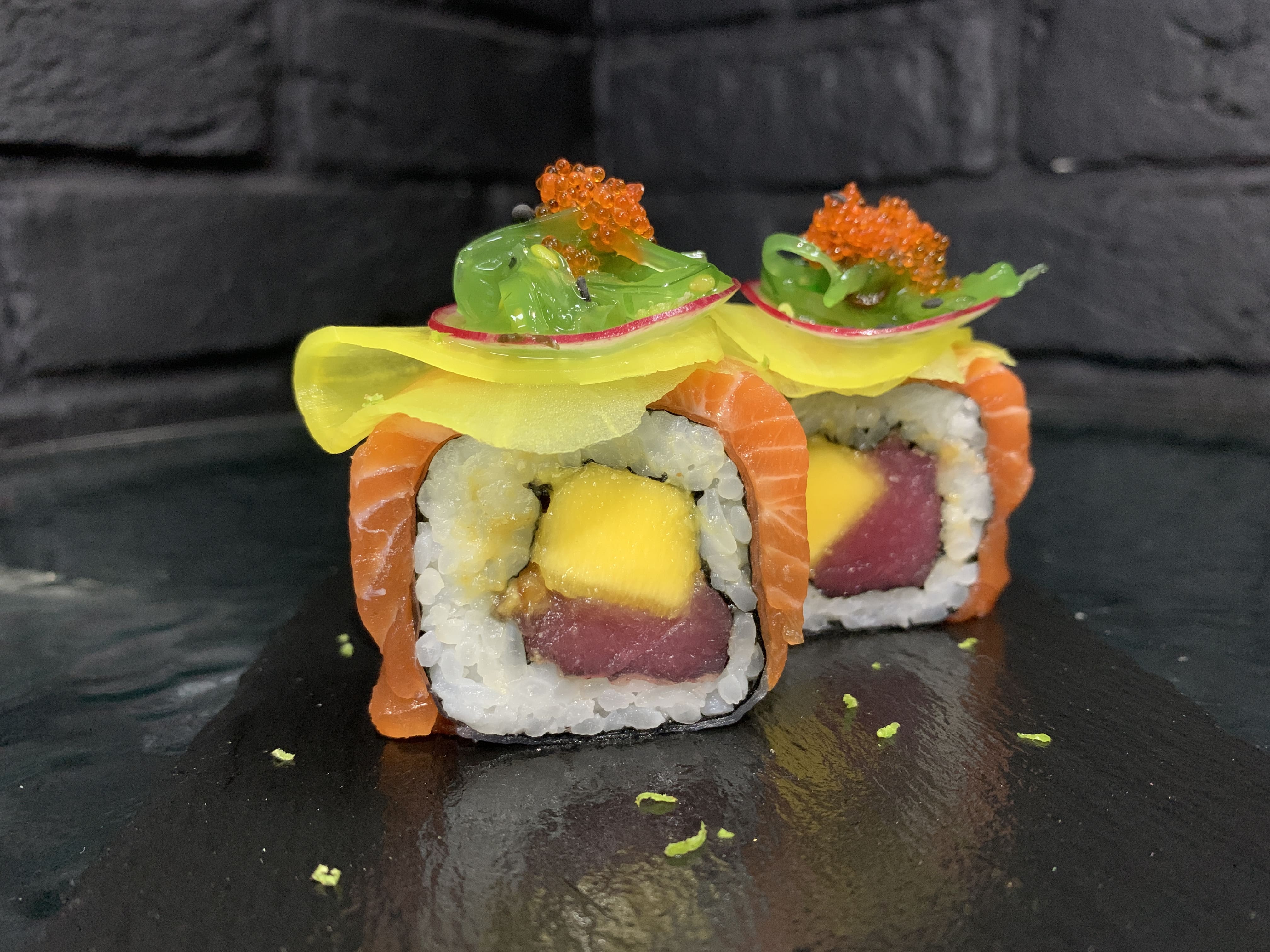 Филе охлажденного лосося, охлажденный тунец (Yellowfin) , икра летучей рыбы (TOBIKKO-SUSHI),специальный пряный соус от БРЕНД ШЕФА, спелый манго, рис, маринованный дайкон (такуан), редис, чукка салат, цедра лайма, кунжут