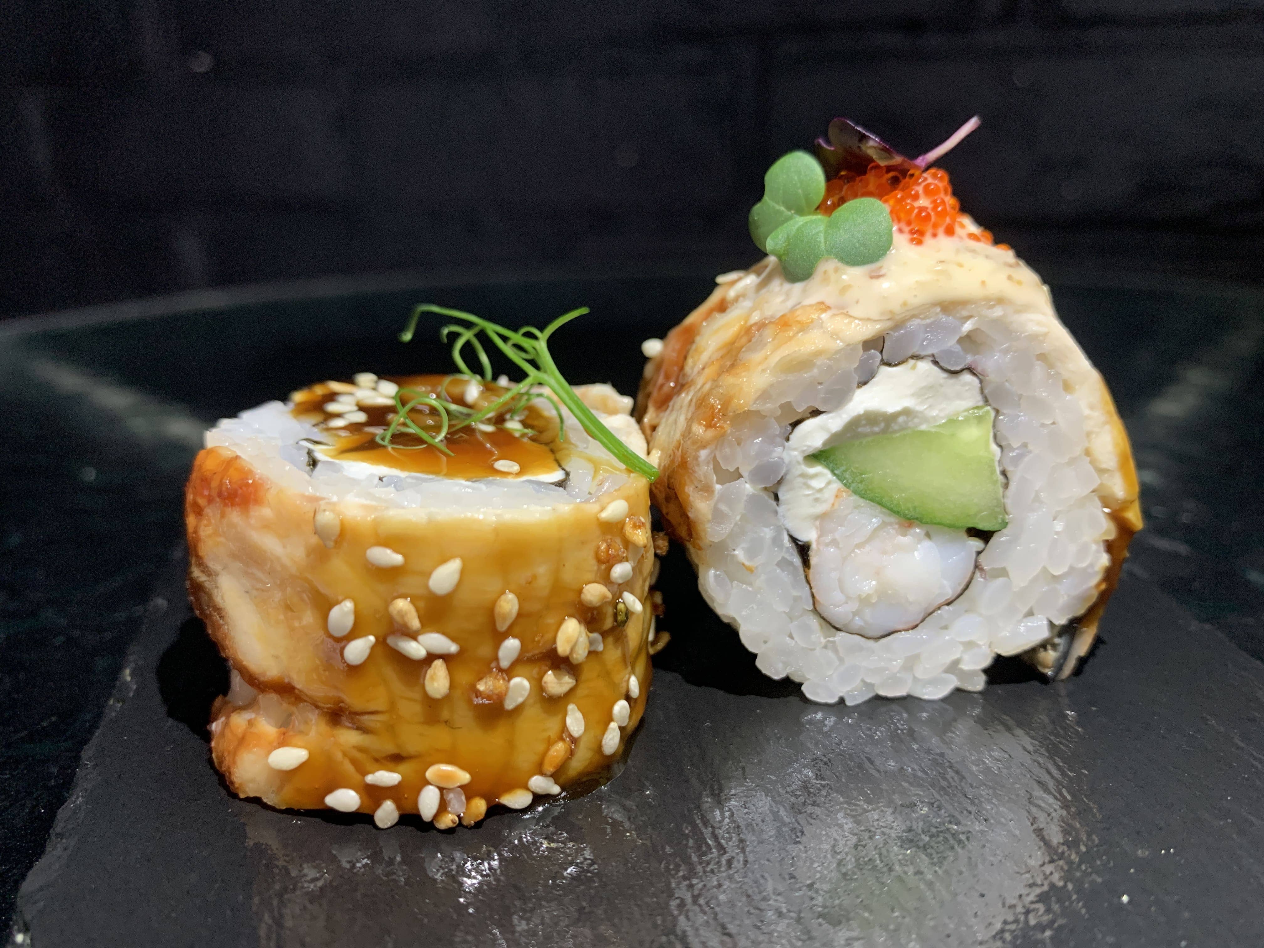 Жареный угорь в соусе унаги, сливочный крем-сыр, тигровая креветка, свежий огурец, икра летучей рыбы (TOBIKKO-SUSHI), соус унаги, соус ореховый