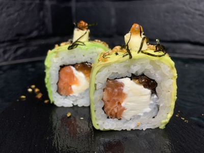Охлажденный лосось, сливочный крем-сыр, икра лосося, спелый авокадо, японский блинчик ЧАКИН, японская специя ФУРИКАКЭ