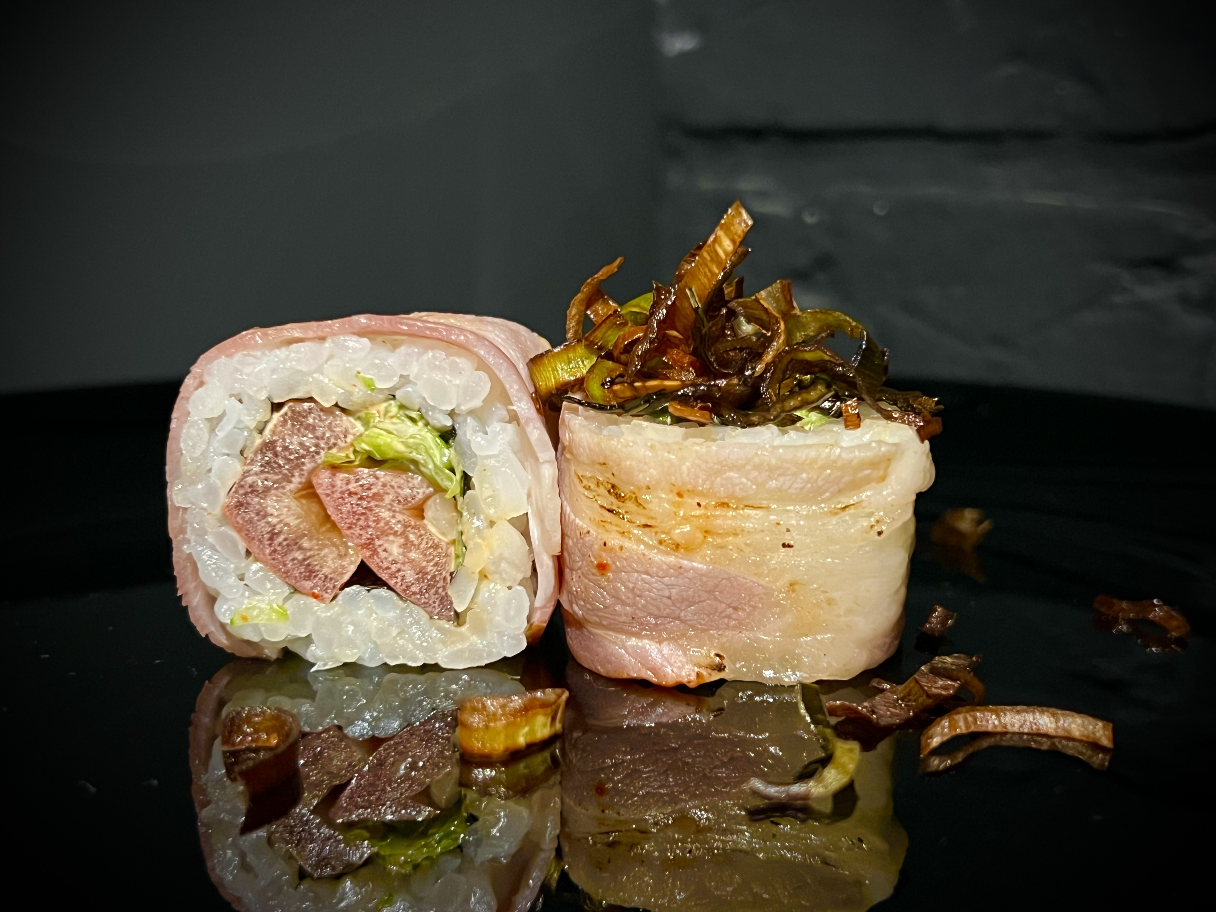 Опаленный бекон, спелые томаты, салат айсберг, спайс соус