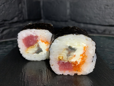 Филе охлажденного тунца Yellowfin, жареный угорь в соусе унаги, сливочный крем-сыр, икра летучей рыбы (TOBIKKO-SUSHI)