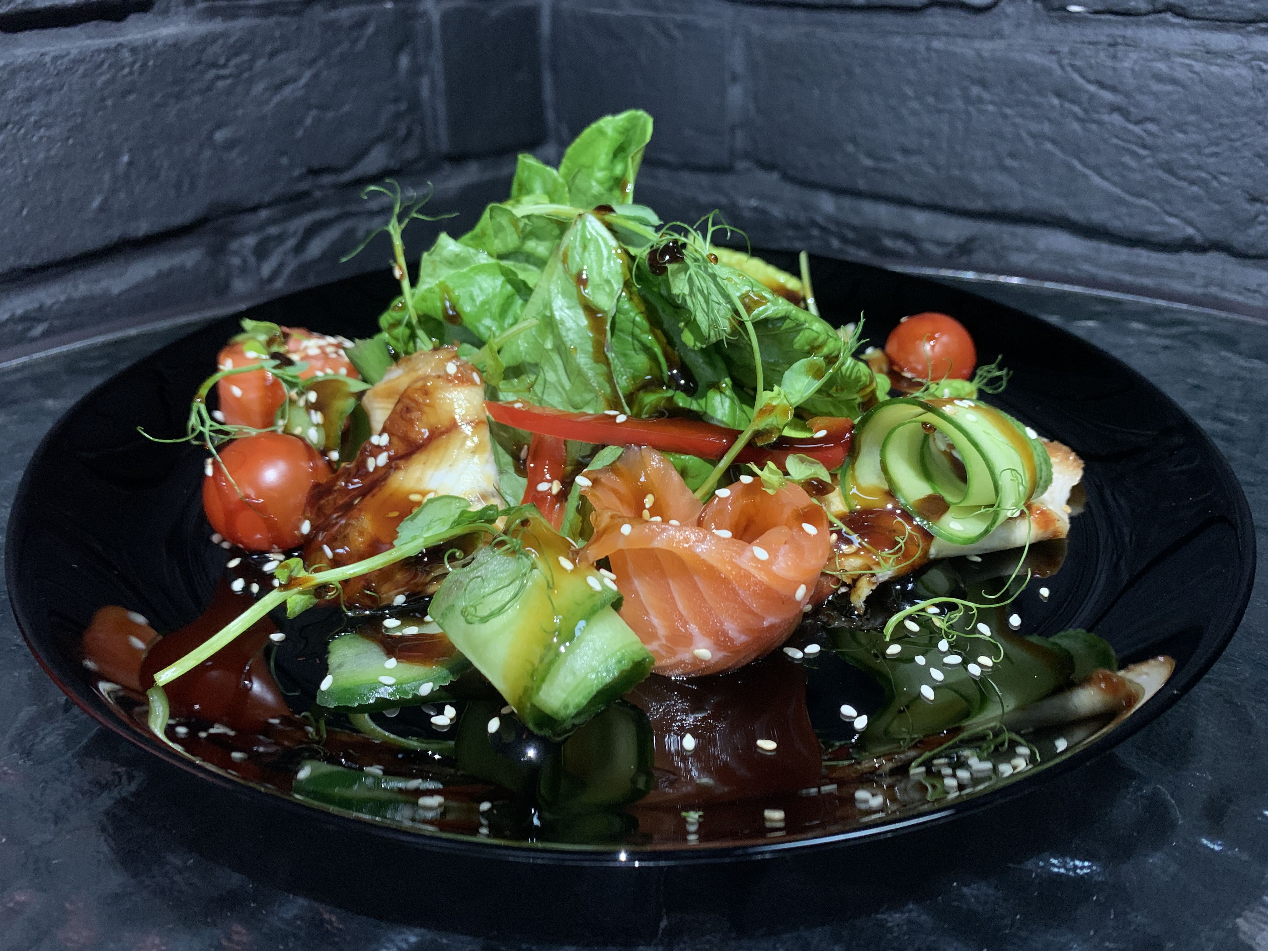 Жареный угорь в соусе унаги, копченная семга, салат Романо, помидоры черри, перец сладкий, свежий огурец, под специальным соусом от Бренд ШЕФА