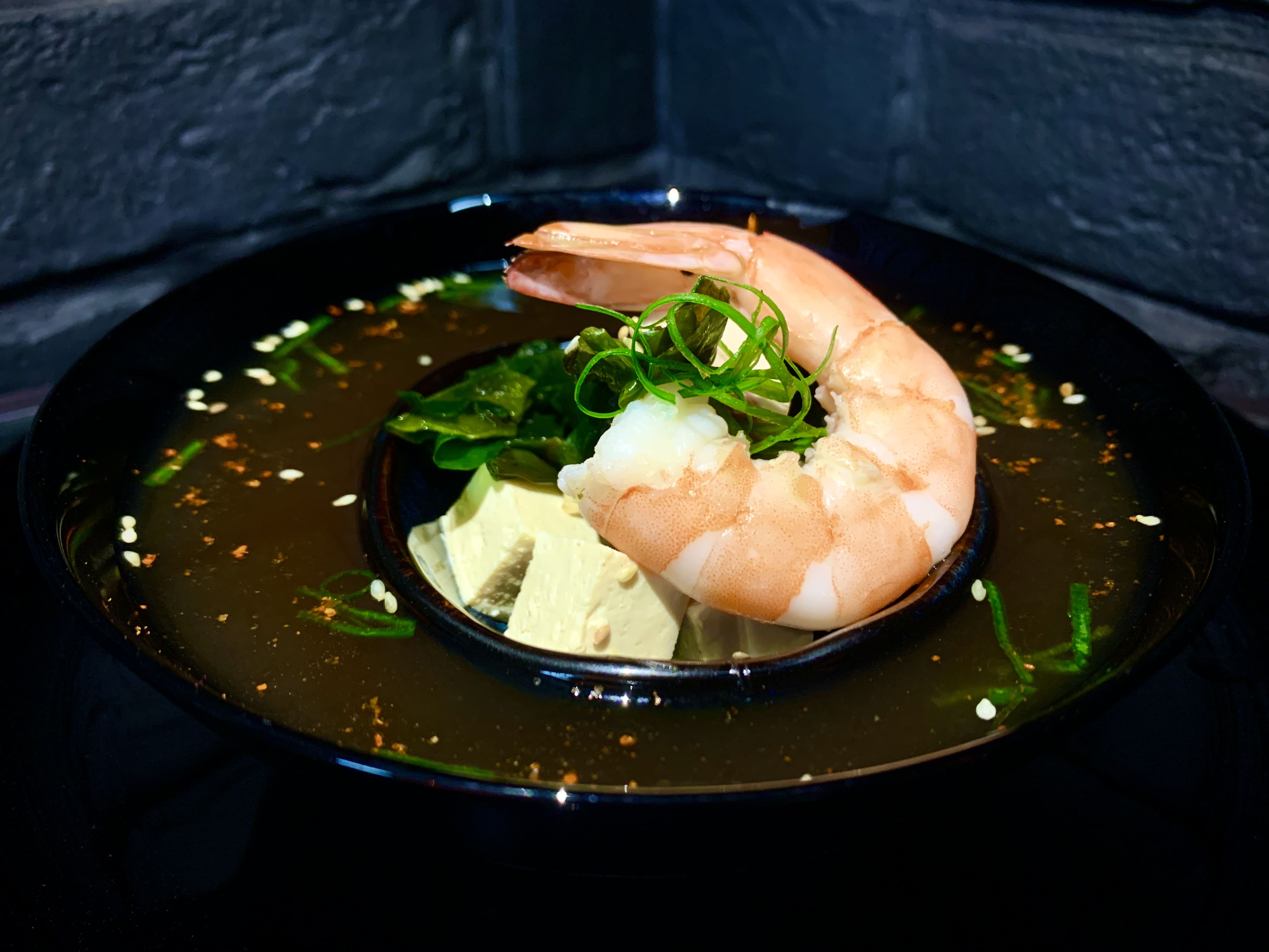 Традиционный Мисо суп с тофу, тигровыми креветками, древесными грибами Моэр, водорослями Вакамэ, зеленым луком и кунжутом