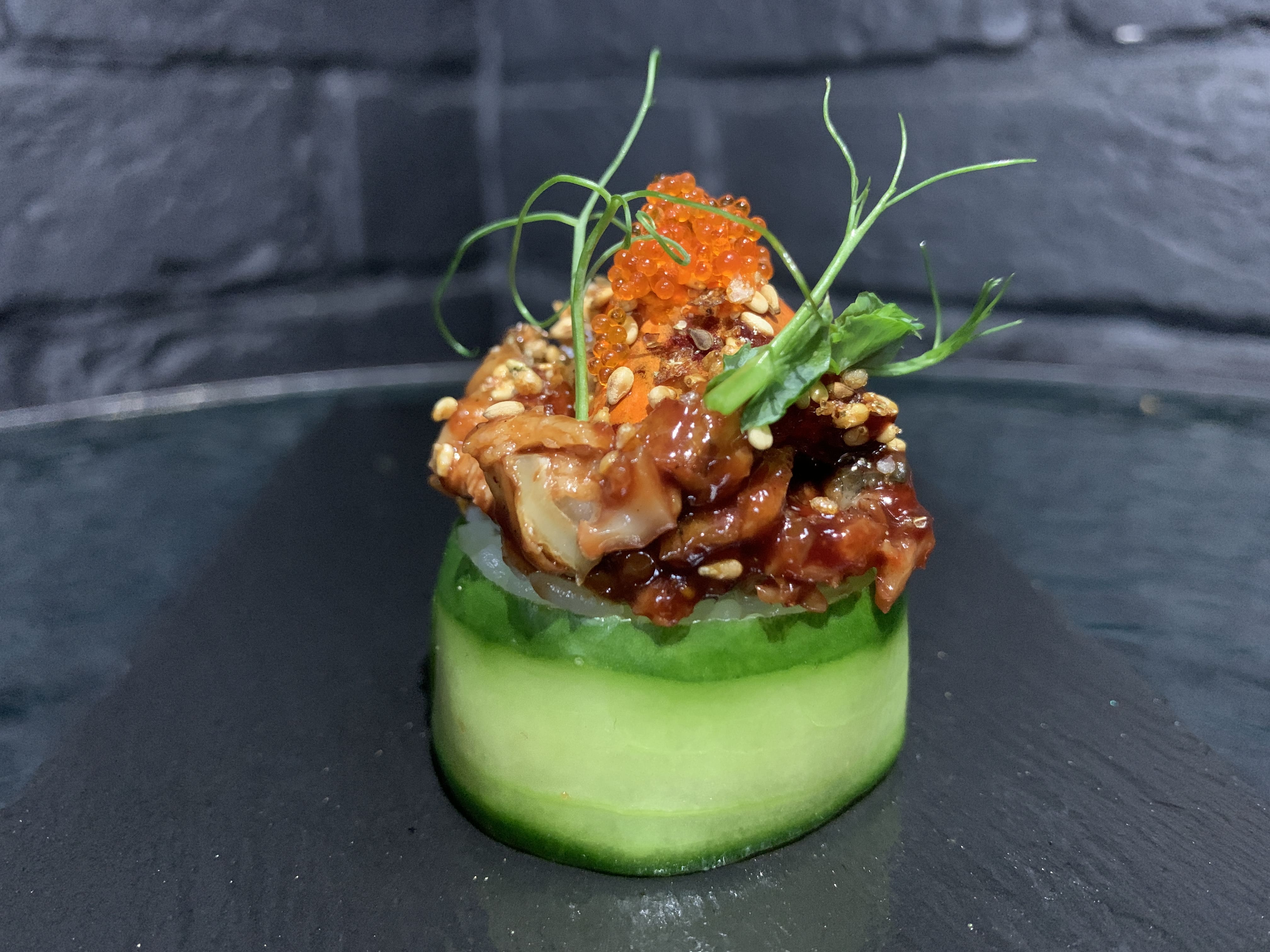 Гункан в огурце, жареная тигровая креветка, специальный соус от Бренд ШЕФА, икра летучей рыбы(TOBIKKO-SUSHI), специи Силасу, японские специи ФУРИКАКЭ (Furikake)
