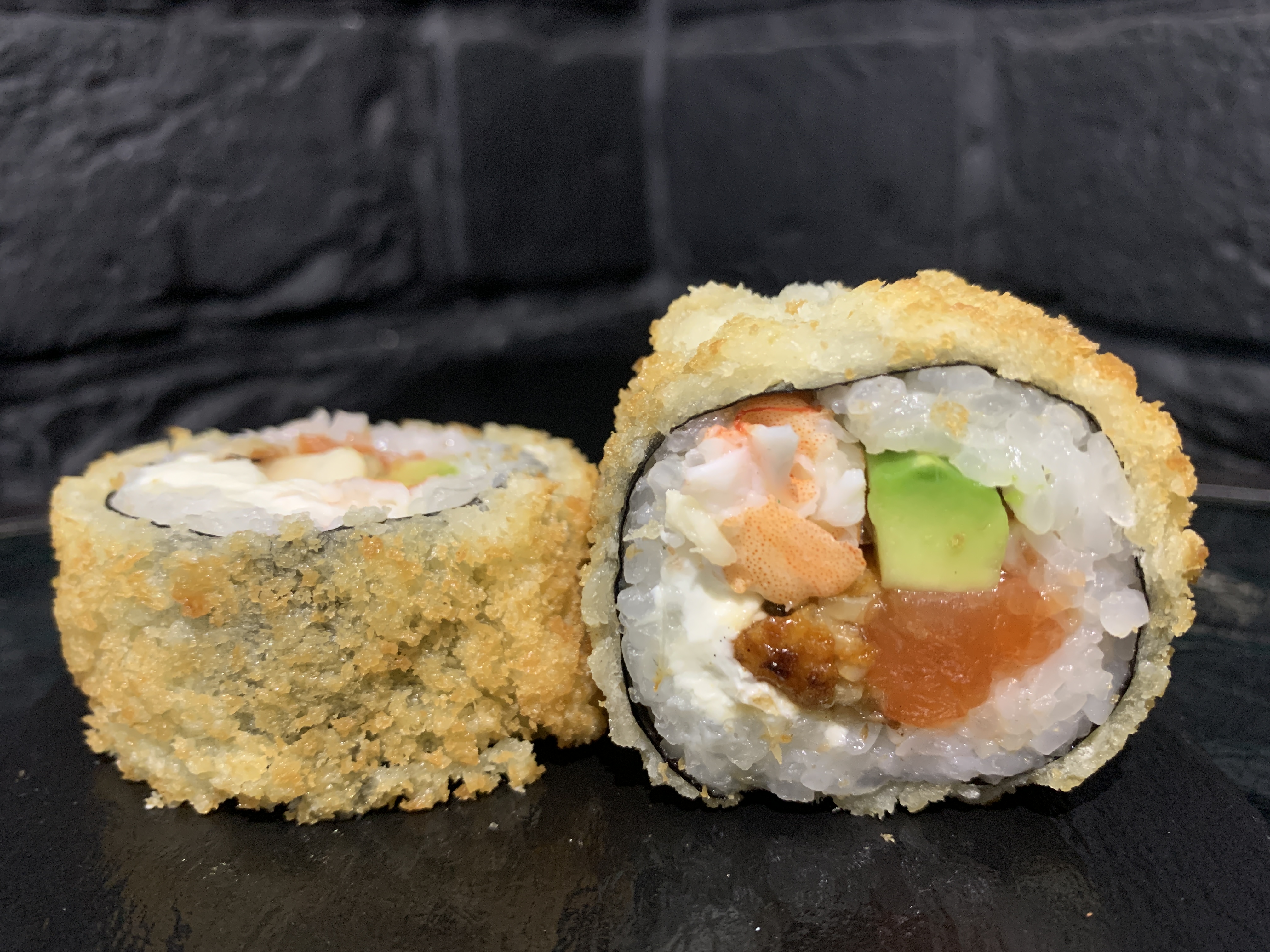 Жареный ролл во фритюре в японских сухариках ПАНКО, тигровая креветка, охлажденный лосось, копченая семга, жареный лосось в соусе тэрияки, специальный соус от Бренд-Шефа, кунжут