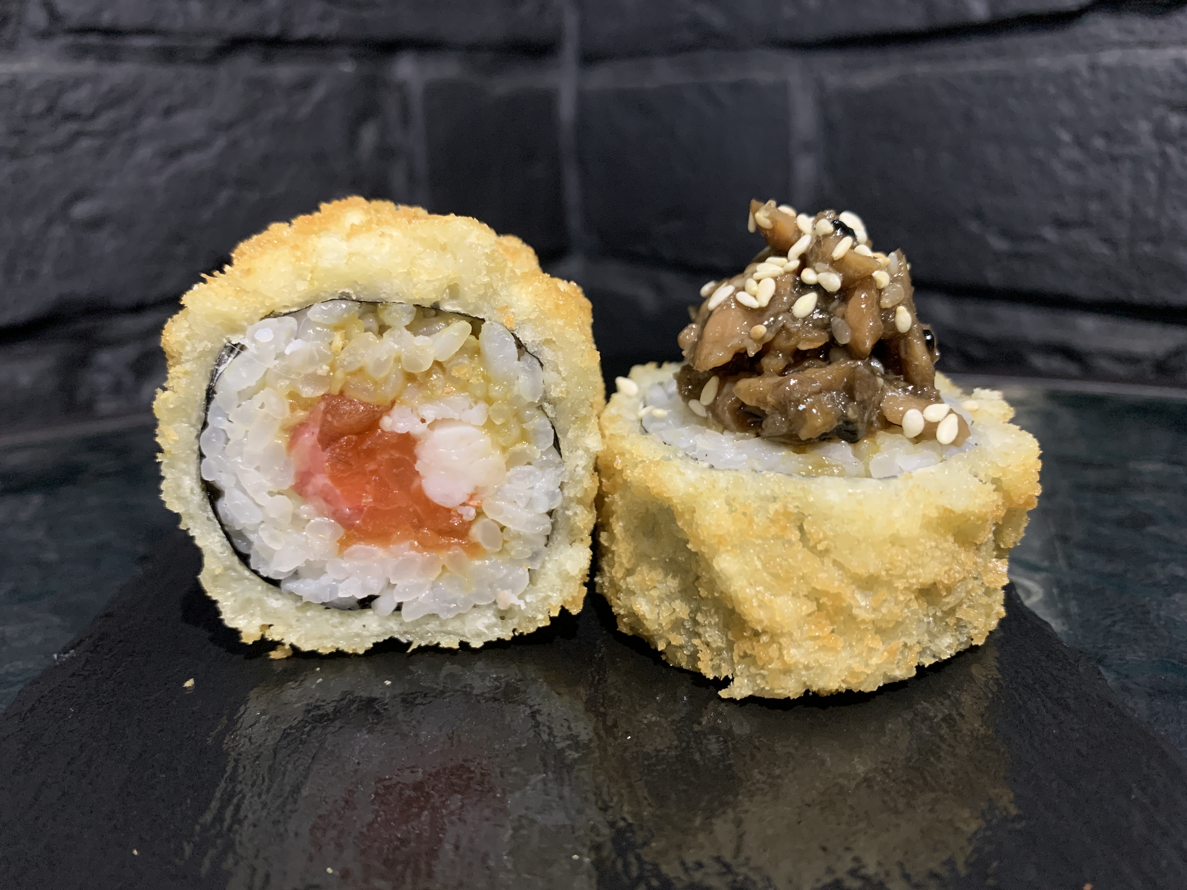 Жареный ролл во фритюре в японских сухариках ПАНКО, тигровая креветка, охлажденный лосось, копченая семга, жареный лосось в соусе тэрияки, специальный соус от Бренд-Шефа, кунжут
