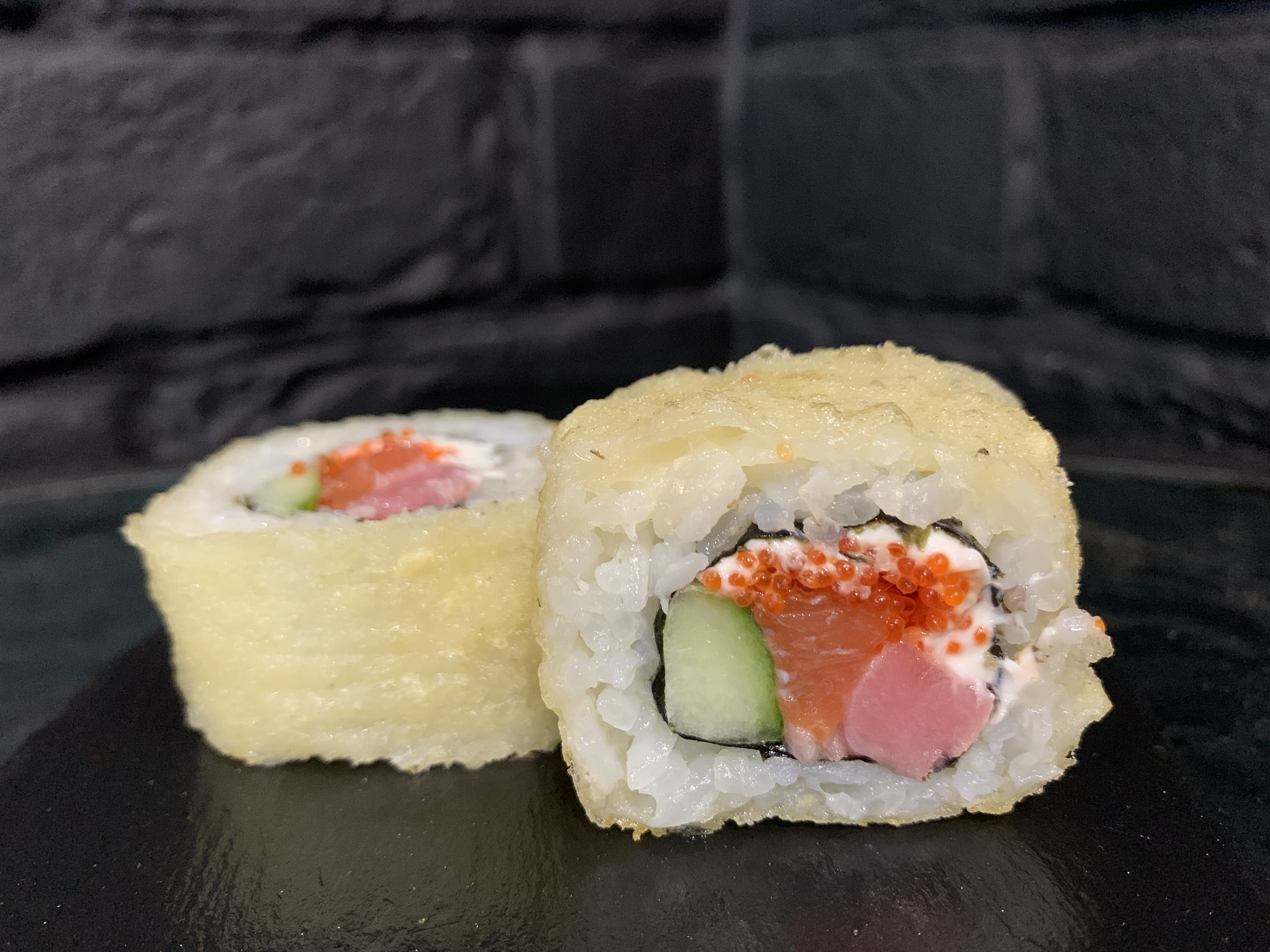 Жареный ролл во фритюре в японских сухариках ПАНКО, охлажденный лосось, охлажденный тунец Yellowfin, свежий огурец, сливочный крем-сыр